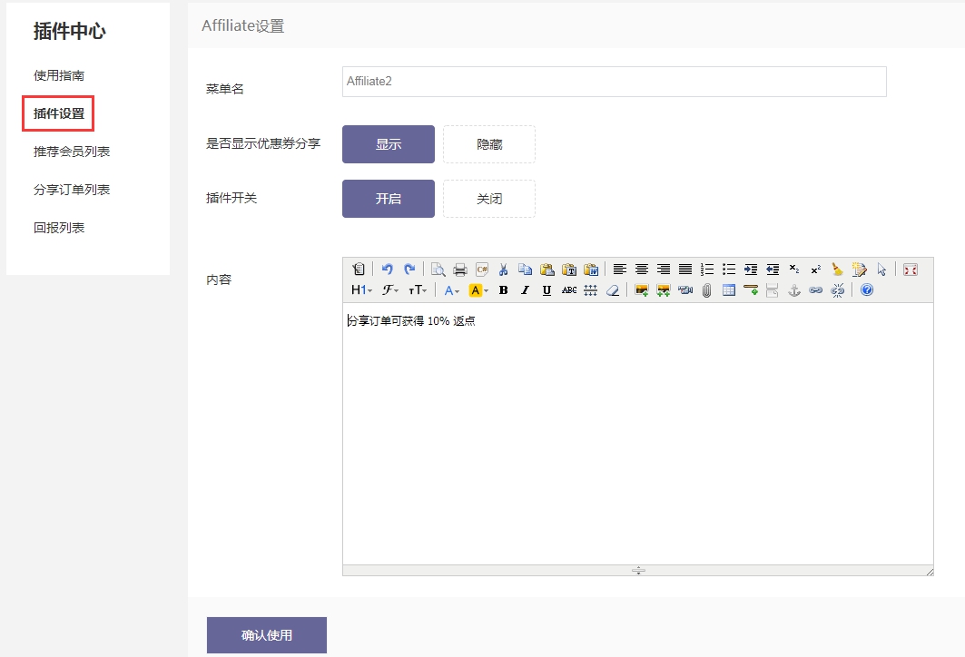 【插件开关】 开启,前台会员中心可显示该插件设置;关闭,前台不显示