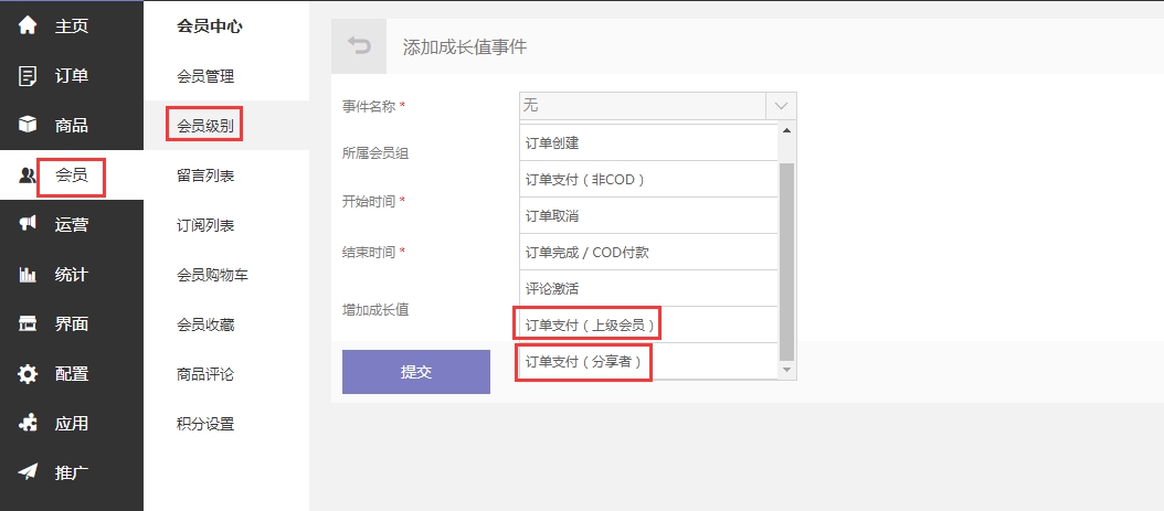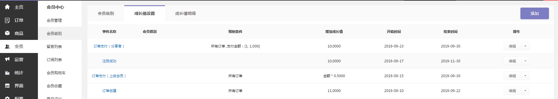 1)、成长值设置,后台【会员】—【会员级别】—【成长值设置】,添加事件。