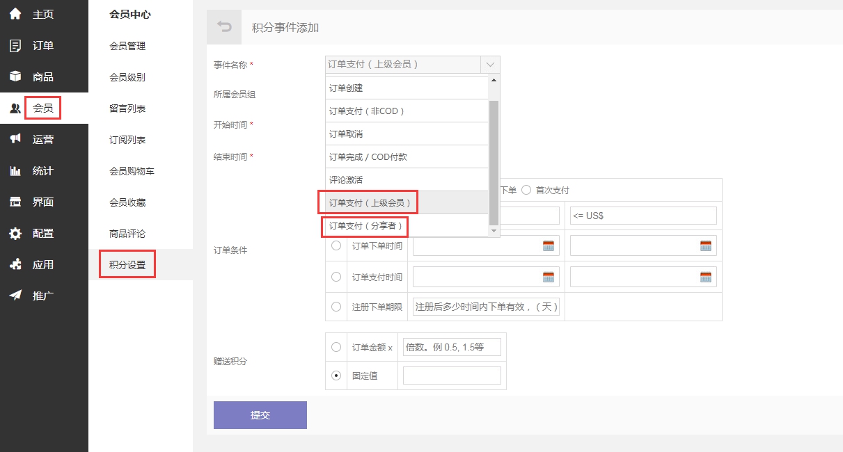 2)、积分设置,后台【会员】—【积分设置】,添加事件。