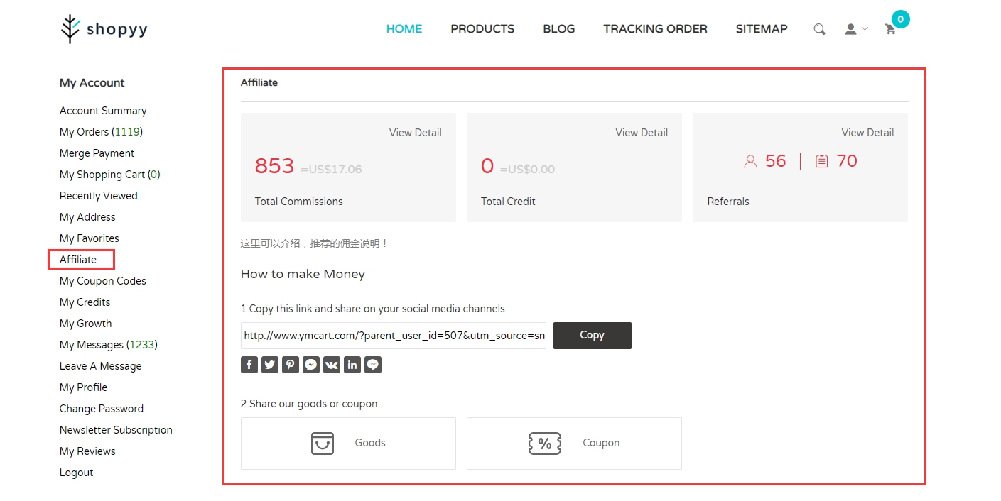 【是否显示优惠券分享】 设置显示,则前台会员中心Affiliate页面显示优惠券分享,隐藏则不显示