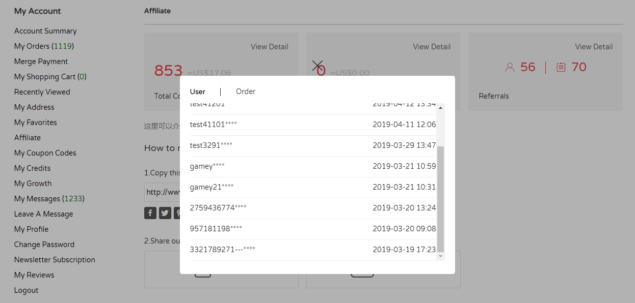 【Referrals】 点击View Detail,可查看被推荐会员名单及订单,只显示最近10条