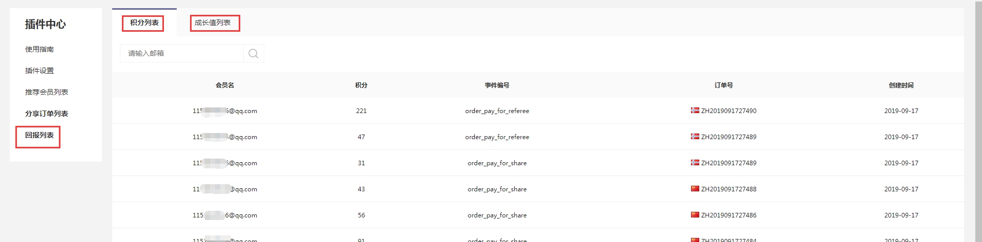 6.回报列表,可查看分享者通过推荐事件获得的积分明细、成长值明细