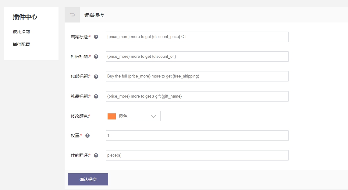【打折标题】 其中{price_more} 和{discount_off}这2个变量不可改动,其余文本部分可自定义编辑