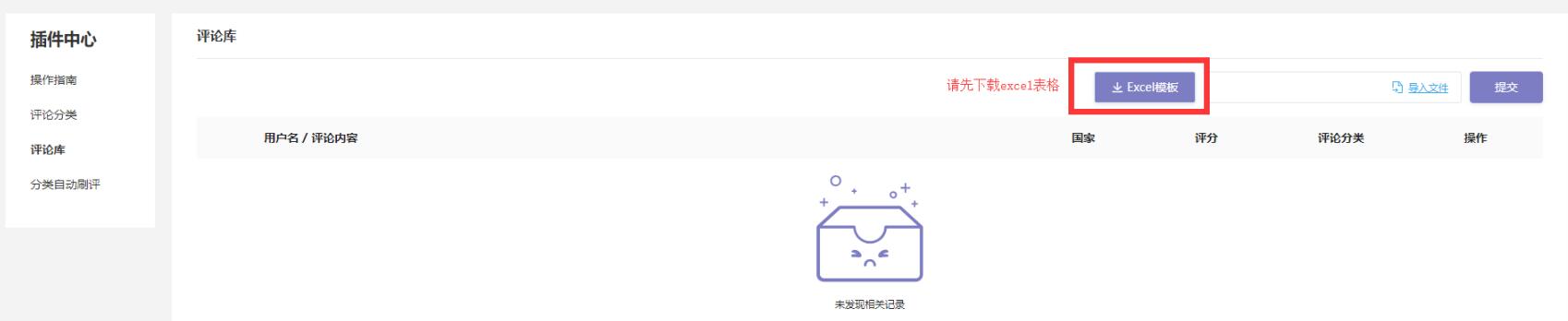 3.评论库模块,首先需要下载excel表格,正确填写之后保存(excel填写规则请注意查看操作指南),点击“导入文件”,点击“提交”就可以了