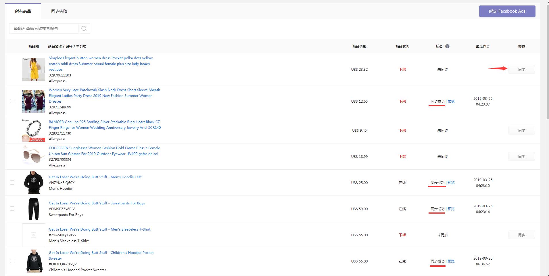 6.返回到插件点击“访问”会显示商品列表,点击商品右侧的“同步”,将商品同步到facebook主页店铺中,通常选择一些有代表性、热销的商品进行同步。已同步的商品同步状态会显示“同步成功”,点“预览”直接查看facebook商品页面(商品需要待facebook审核通过后,此处预览才会正常打开)