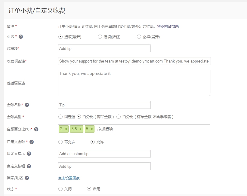 【自定义金额】 根据需要选择是否允许,设置允许时前台会显示一个输入框让买家自定义输入金额