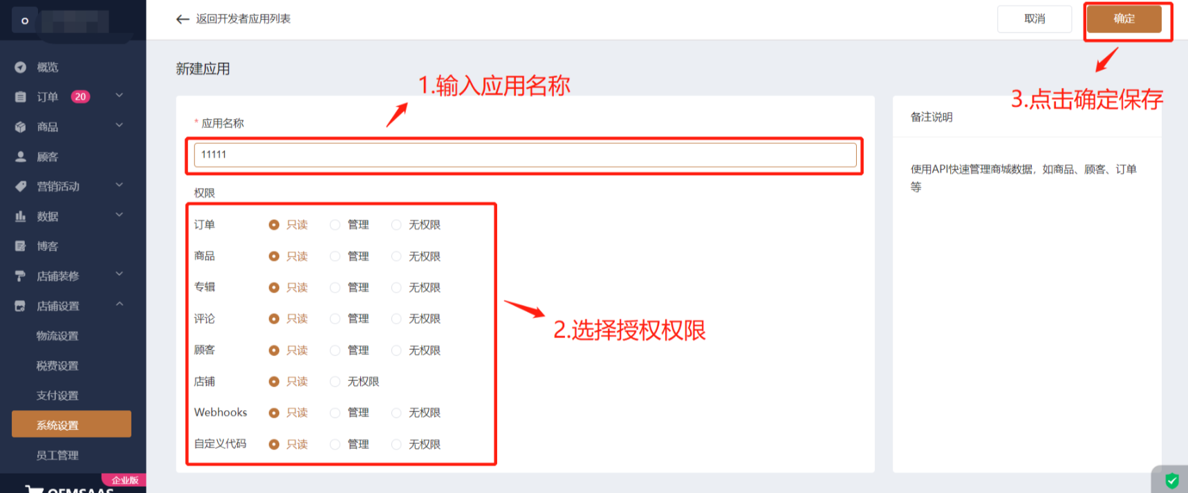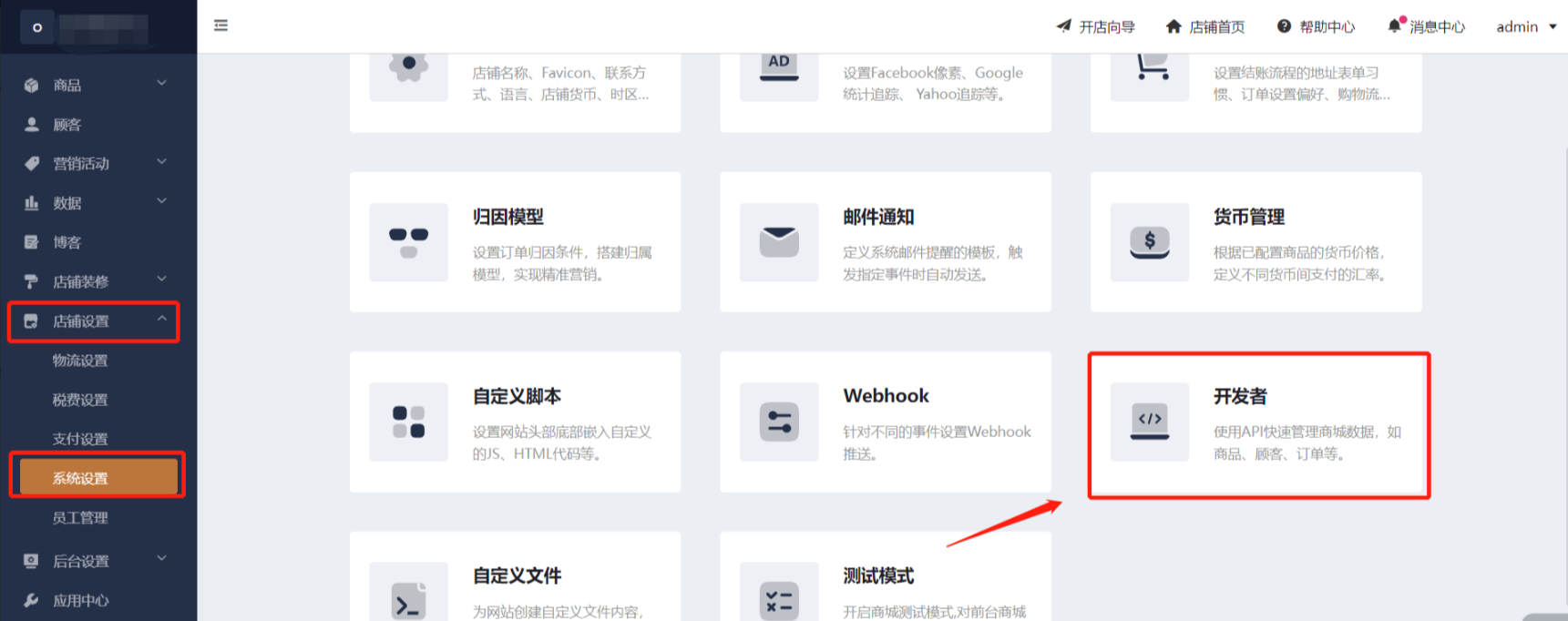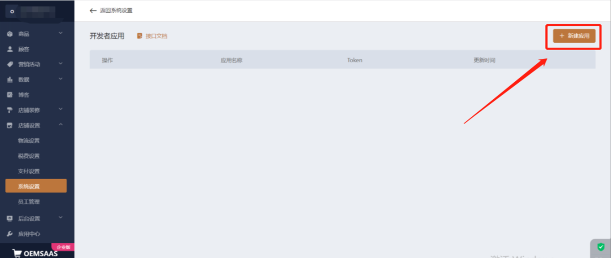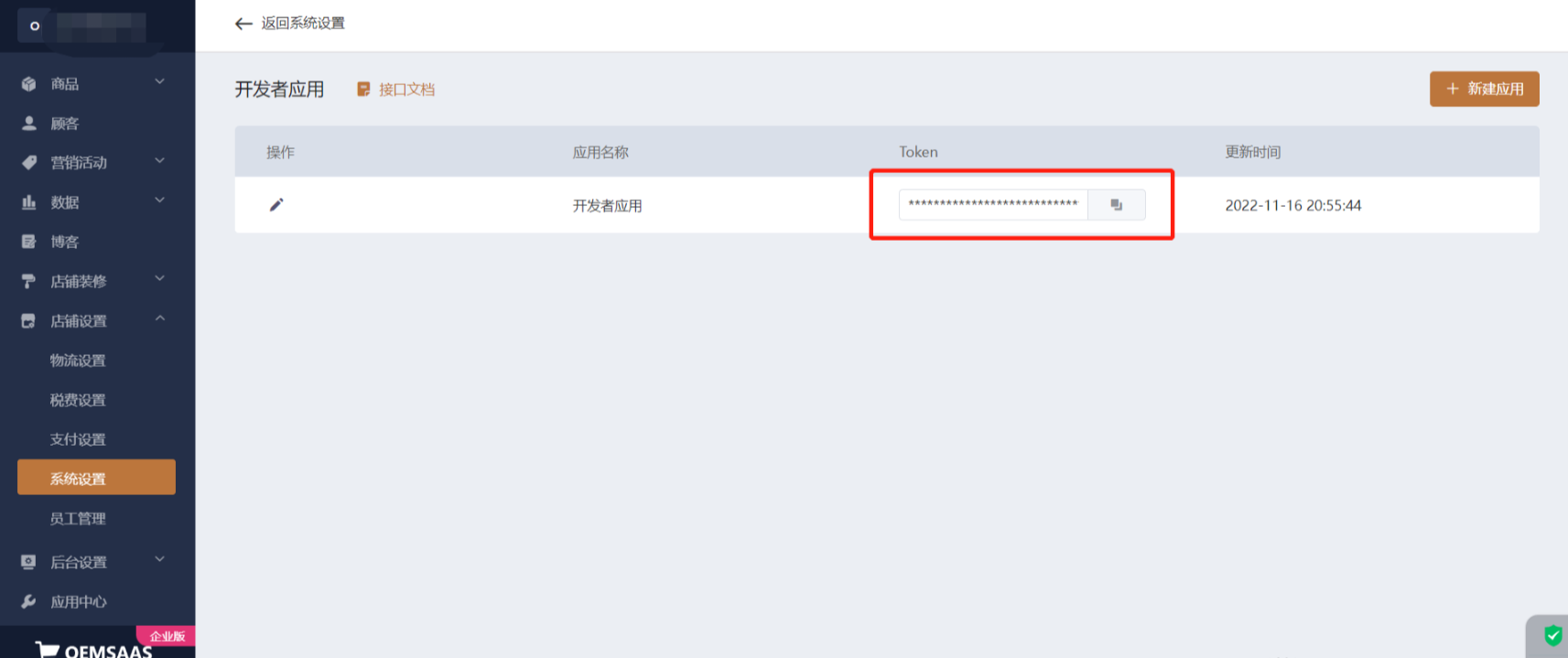 (1)登入oemsaas后台,点击“店铺设置”—“系统设置”—“开发者”,