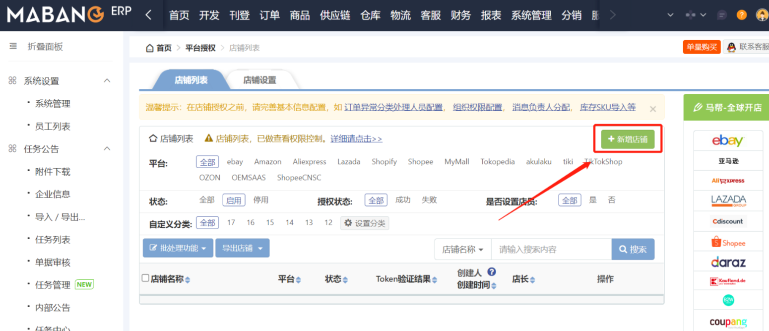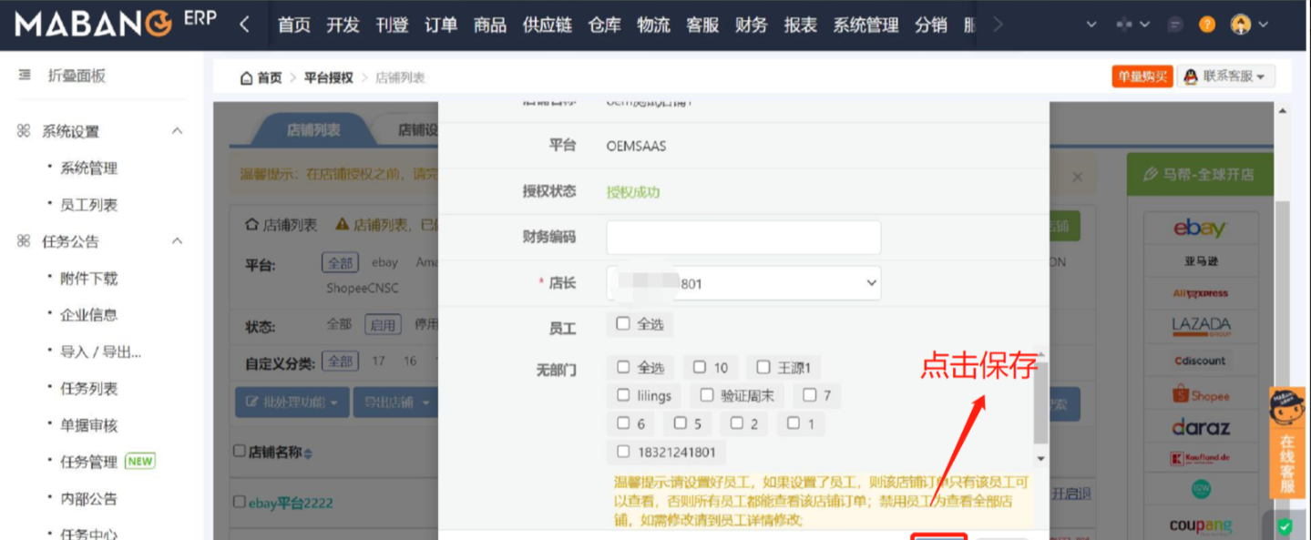(4)设置权限,点击保存,则店铺授权成功正常使用;