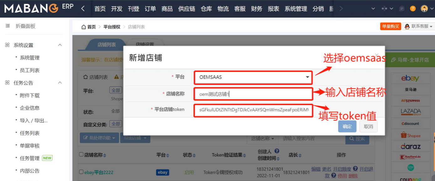 (3)选择平台(oemsaas),输入“店铺名称”(自定义名称),输入在omesaas平台生成的“TOKEN”,点击确定