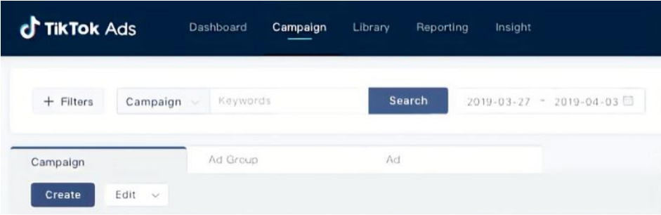 在 TikTok Ads 仪表板中,单击页面顶部的 Campaign 选项卡,然后单击Create 按钮