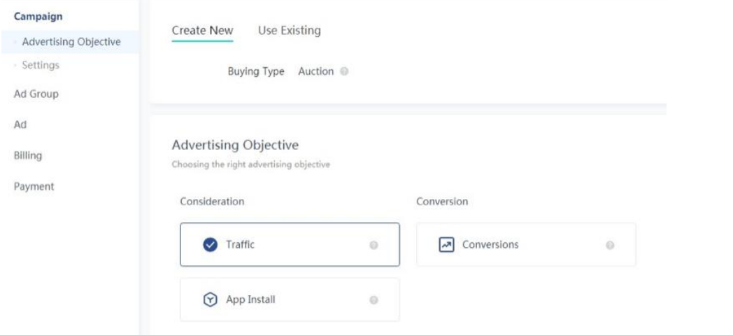 接下来,选择一个广告系列目标,这是广告的主要目标。你可以从以下三个选项中进行选择:流量、转化和应用安装量。