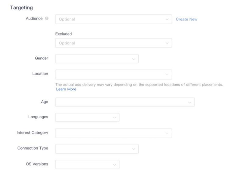 下一步是为广告系列制作一个广告组,然后选择展示位置和定位。TikTok 广告仪表板使你可以选择要在其上投放广告的确切平台。不仅包括TikTok,还包括其旗下的所有应用程序,例如 Vigo Video(只限印度)、BuzzVideo、News Republic 等。还有一个自动展示位置选项,TikTok 会确定广告在哪些位置效果较好,并将其放置在该位置。