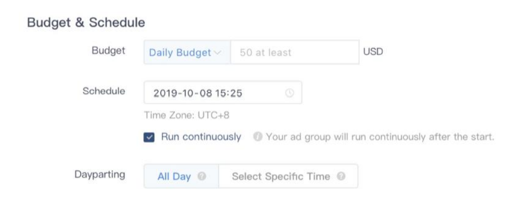 然后,你就可以为 TikTok 广告选择预算、时间表和目标了。设定预算和时间表你可以在“Budget & Schedule”部分中设置广告组的预算,可以选择每日预算(或总预算(广告投放期间花费的总金额)。请注意,广告组级别的每日预算和总预算低至少为 50 美。