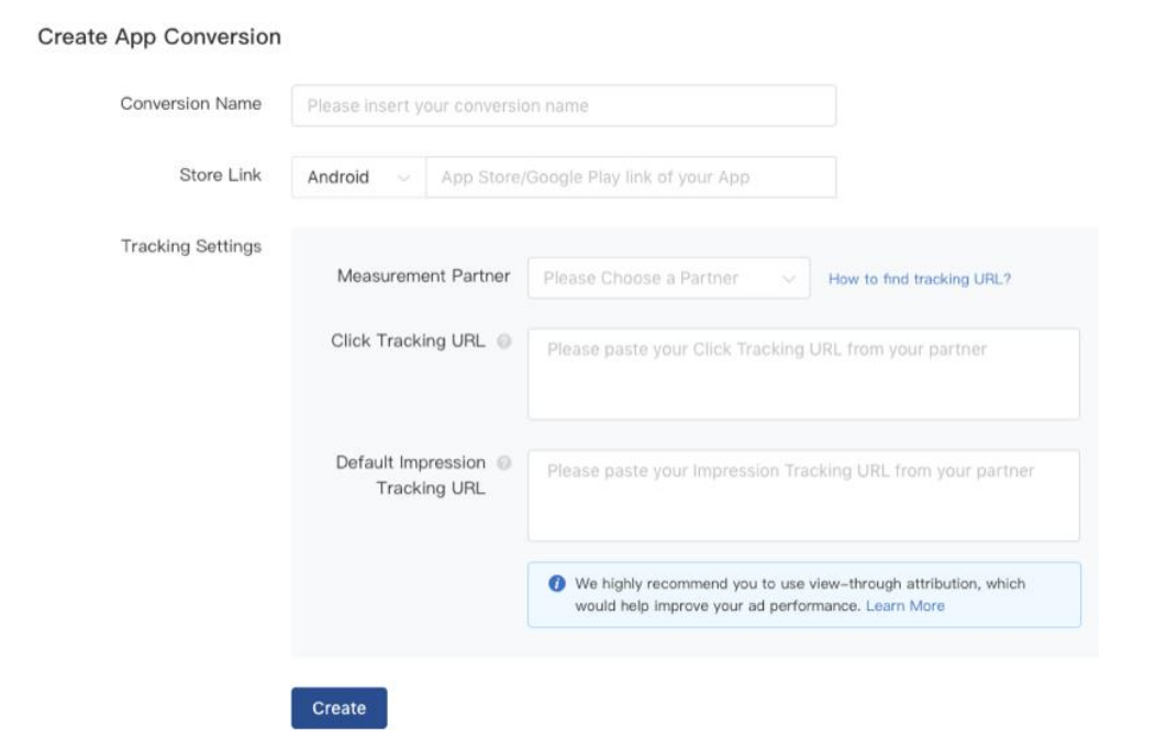 如果你选择转化作为目标,则可以将广告投放给更有可能转化为产品或服务的用户。要追踪所有可能带来转化的操作(例如,应用程序下载或表单提交),请通过单击“Library”并选择“Conversions”来创建转化行为。在此处,你需要确定是要追踪程序的安装量还是着陆页上特定元素的转化情况 。要追踪应用安装量的转化情况,你需要输入名称,在 Google Play 或 AppStore 中输入指向你应用的链接,然后开始衡量广告带来的转化。