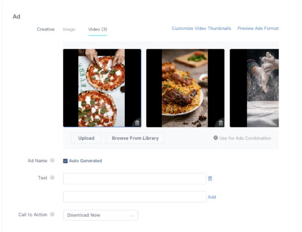 提示:除了视频创建工具之外,还可以利用其他内置广告工具。在广告组级别中,可以使用 Automated Creative Optimization 工具(如下所示),至多可以上传 10 张图像或 5 个视频、5 个广告文案和 1 个 CTA,然后将广告素材资源组合成多个广告。该工具将在整个广告系列中测试这些广告,并向目标受众展示效果好的素材组合。