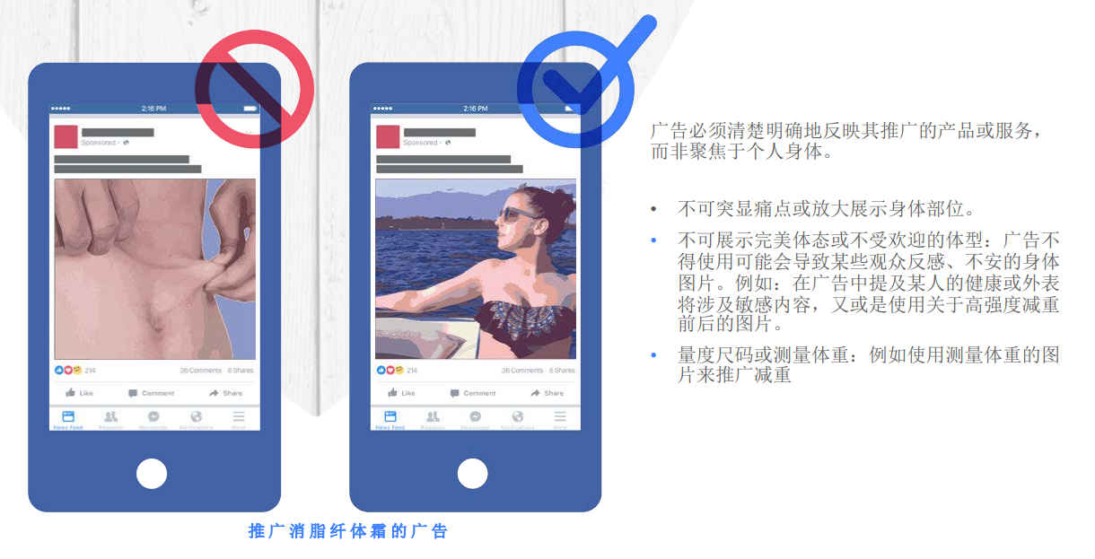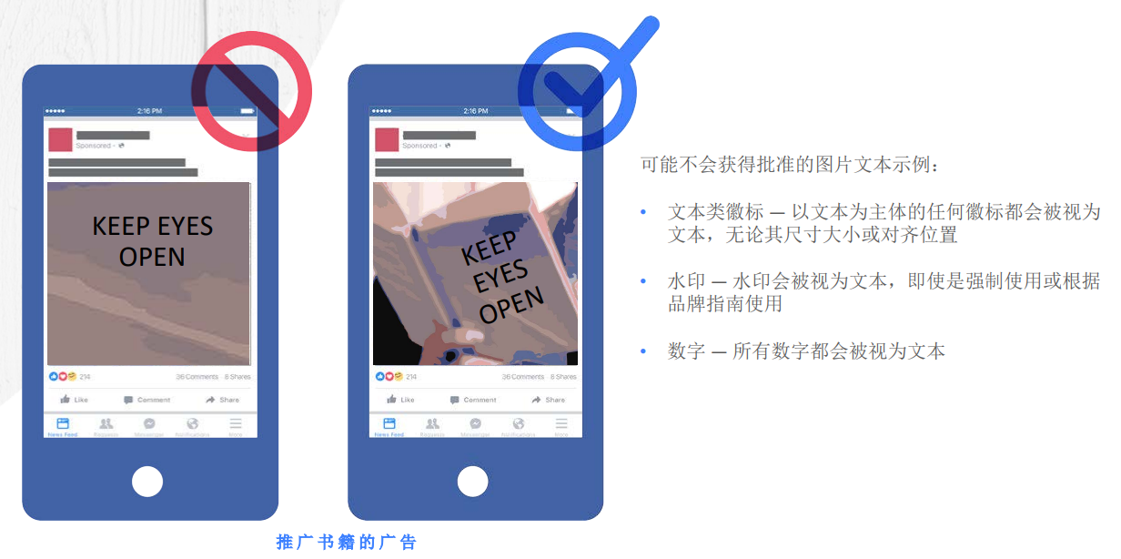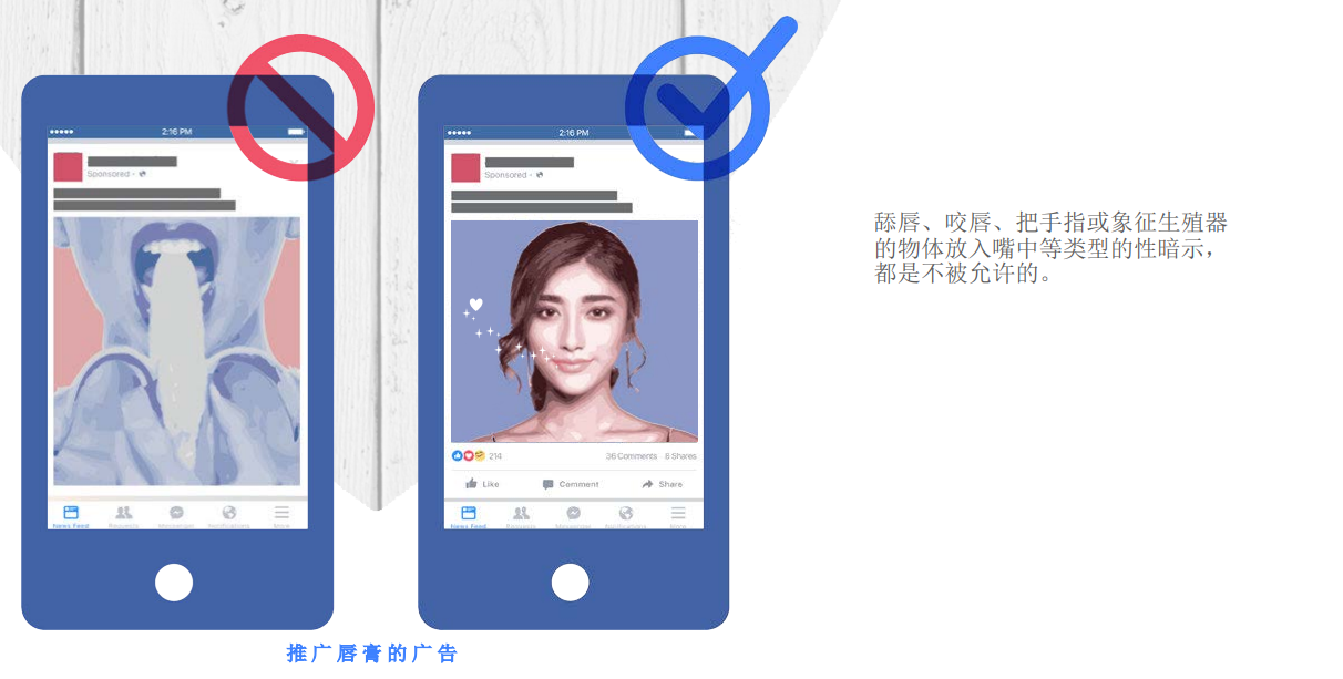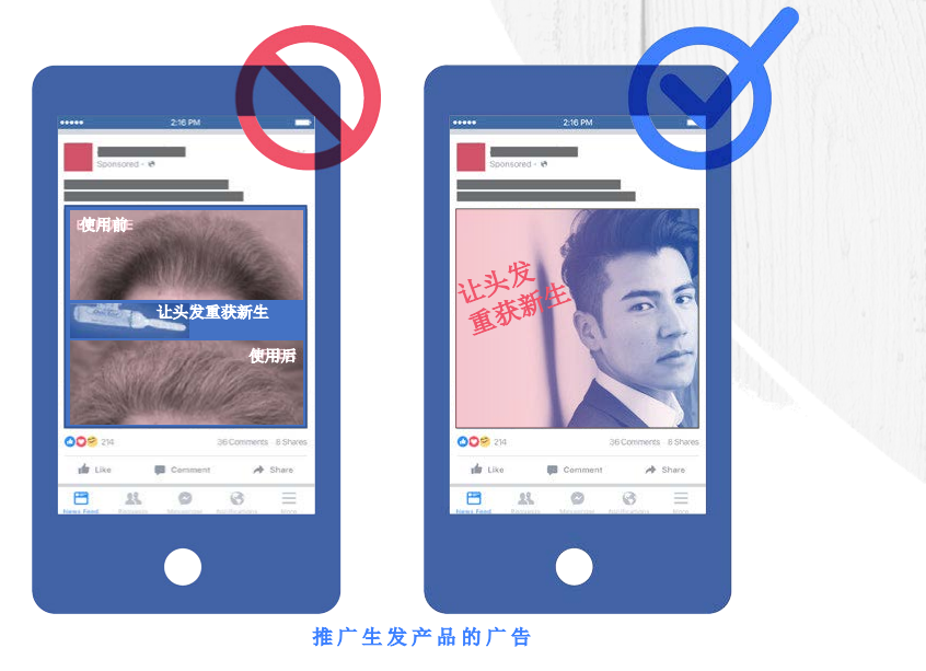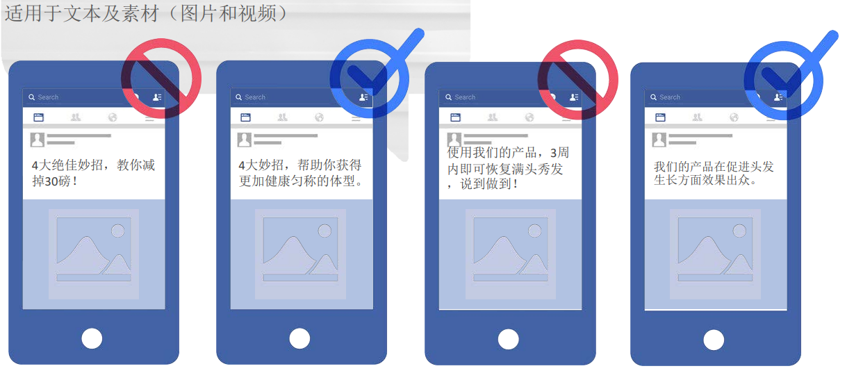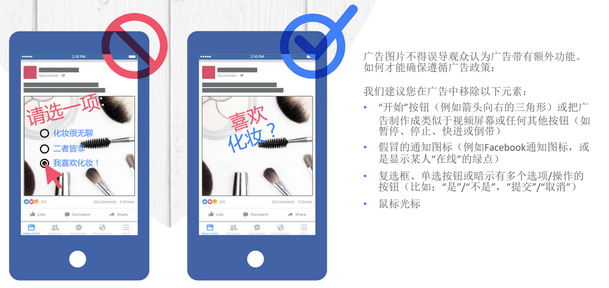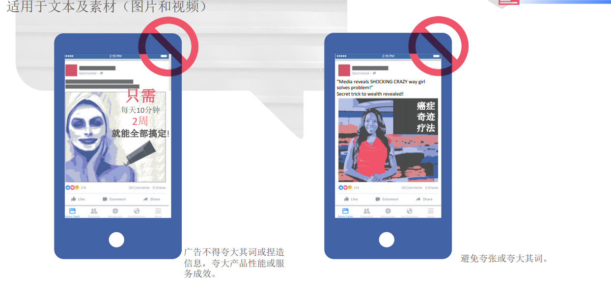 • 在广告中使用带有Facebook或Instagram特征的元素(如:点赞),或使用Facebook的图标、图片、截图、商标或版权(如:Facebook、脸书、FBook、FB、“戳一下”(Poke)、时间线等)。