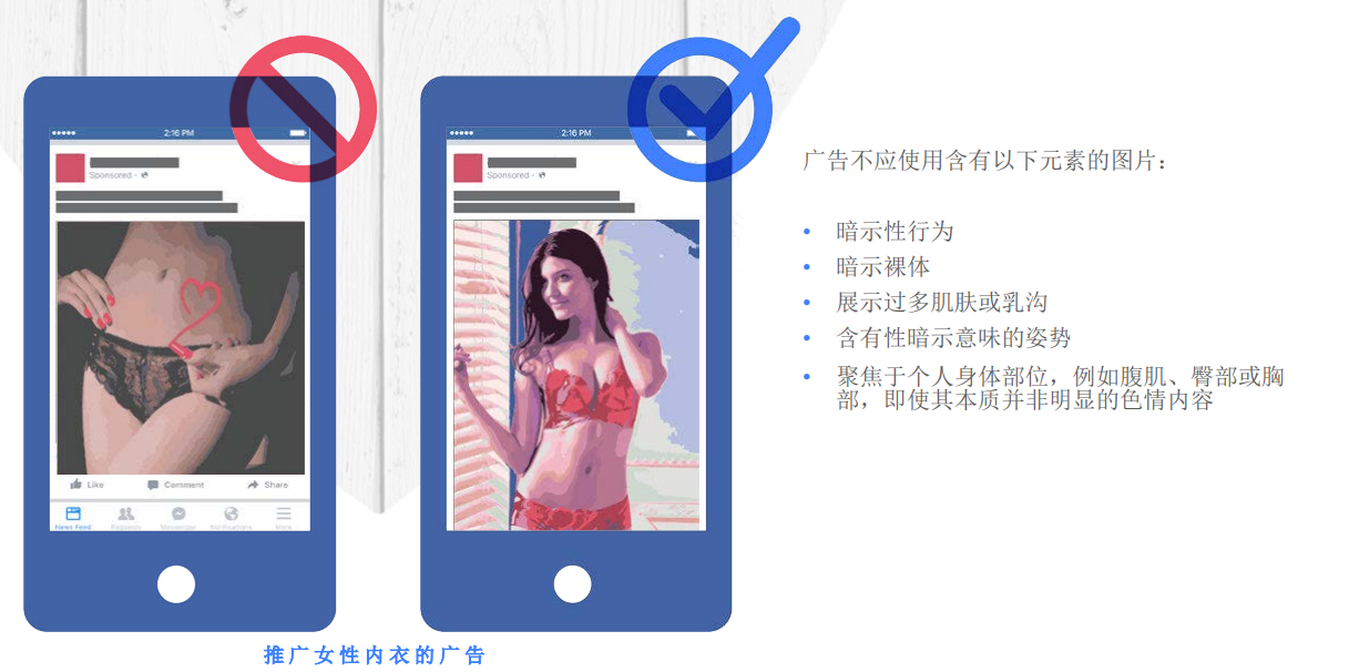 广告不得推广或促进成人用品和服务的销售及使用,包括但不限于玩具、视频、刊物、现场表演或性功能增强产品。任何非手术的丰胸产品也同样被归类为成人内容。在遵循适当的受众定位要求的情况下,计生和避孕广告则可获得批准。