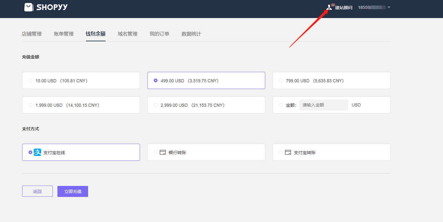 网站后台,系统设置–>账单–>充值-跳转到充值页面