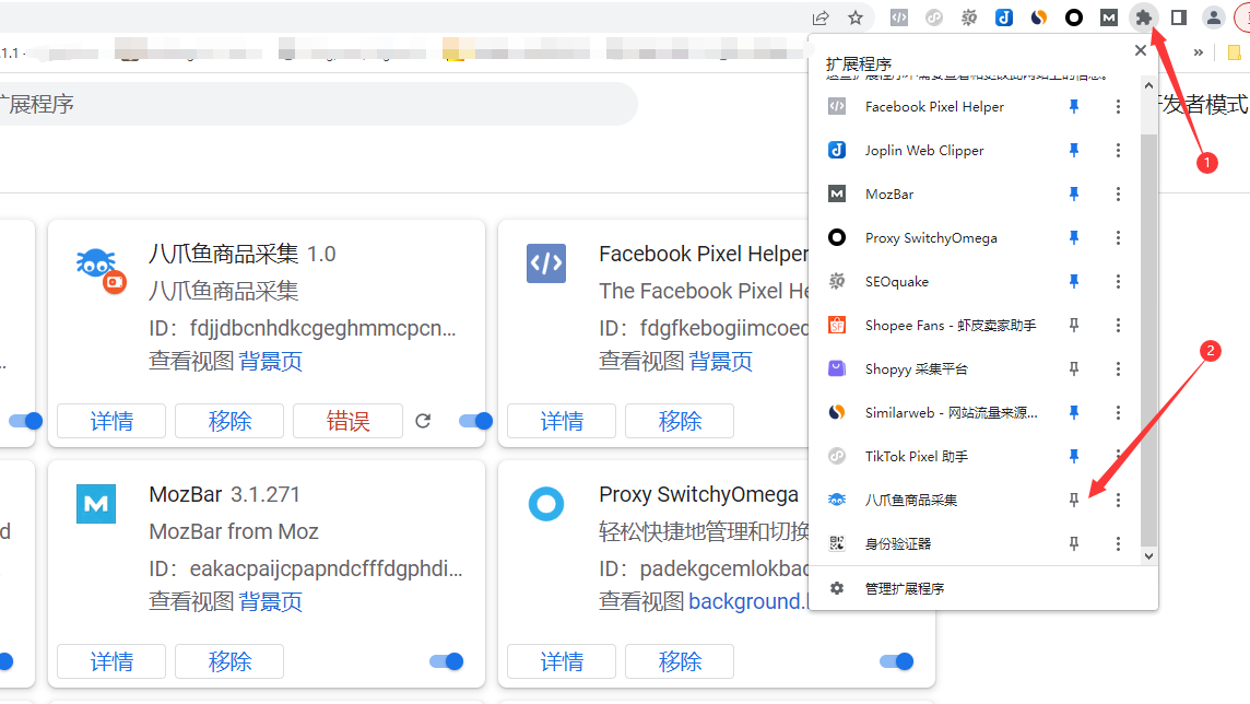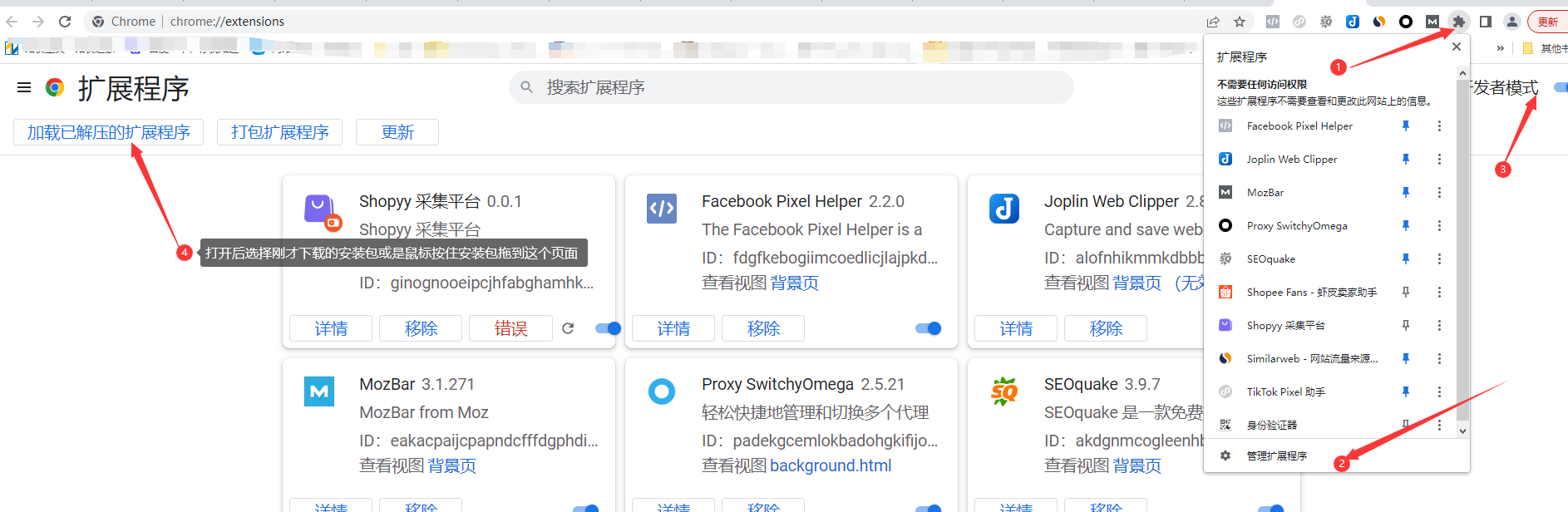然后打开浏览器,如图所示点击扩展程序,开发者模式没有开启要点击开启,加载已解压的安装包或是拖拽到这个页面即可。
