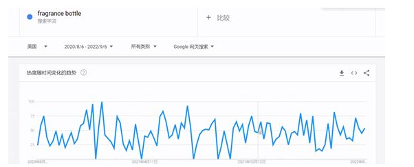 据谷歌趋势显示,香水分装瓶在近两年搜索趋势比较稳定,属于功能性产品,目前市场上热销产品部主要以便携性小毫升数的分装瓶,热搜关键词为portable fragrance bottle、halston fragrancebottle、halston fragrance。
