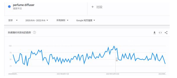 从谷歌趋势近两年数据可以看出,香氛扩散器在每年的10月份到12月份将会迎来一个旺季。所以在八九月份正式补品备货的好时机。香氛扩散器类产品热搜关键词主要有perfume atomize、perfume atomize portable、hotel collection、jo malone car diffuser、air freshener for home、vanilla essential oil等