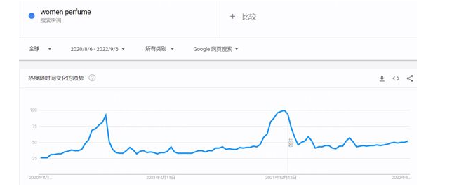 据谷歌趋势近两年数据显示,每年10月份到次年1月份女士香水会迎来明显的爆发期,尤其是节日类香水套装、香水礼盒类产品需求比较旺盛。