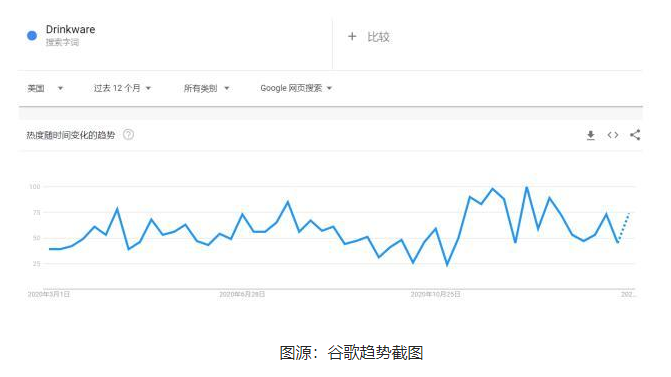 从谷歌趋势可以看出,Drinkware整体呈上升趋势,搜索热度稳中有升。